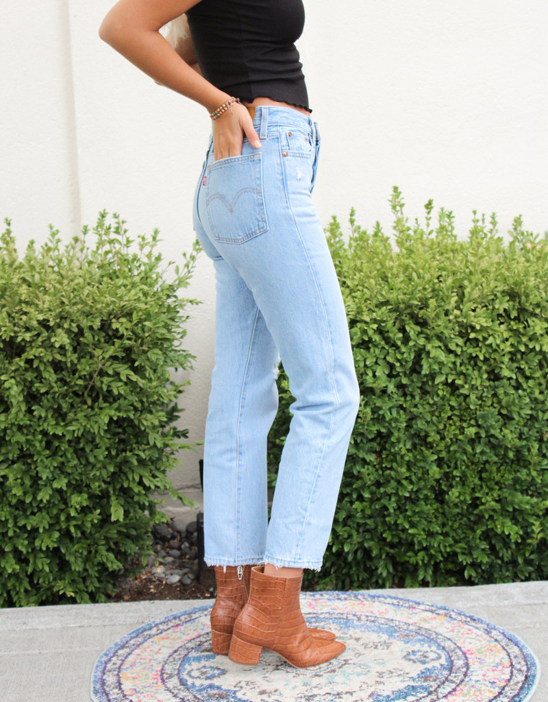 The straight leg and somewhat cropped hem of the jeans make these look adorable with sandals for summer of course and they look super sassy and unique with booties. Levis Womens Ribcage Straight Ankle Jeans.